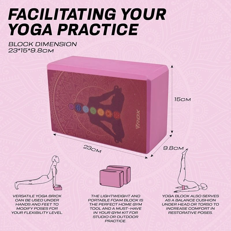 Add this optimally sized yoga block (23*15*9.8cm) to your home gym essential and yoga accessories for increased versatility in your practice. Cultivate healthy energy flow by bringing balance and alignment in your form and everyday life with the RDX EVA Foam yoga blocks. Made for beginner and intermediate yogis alike, this sturdy foam yoga block provides strong support for your bridge poses, and comfortable lift to perfect your alignment in the crescent moon stance.