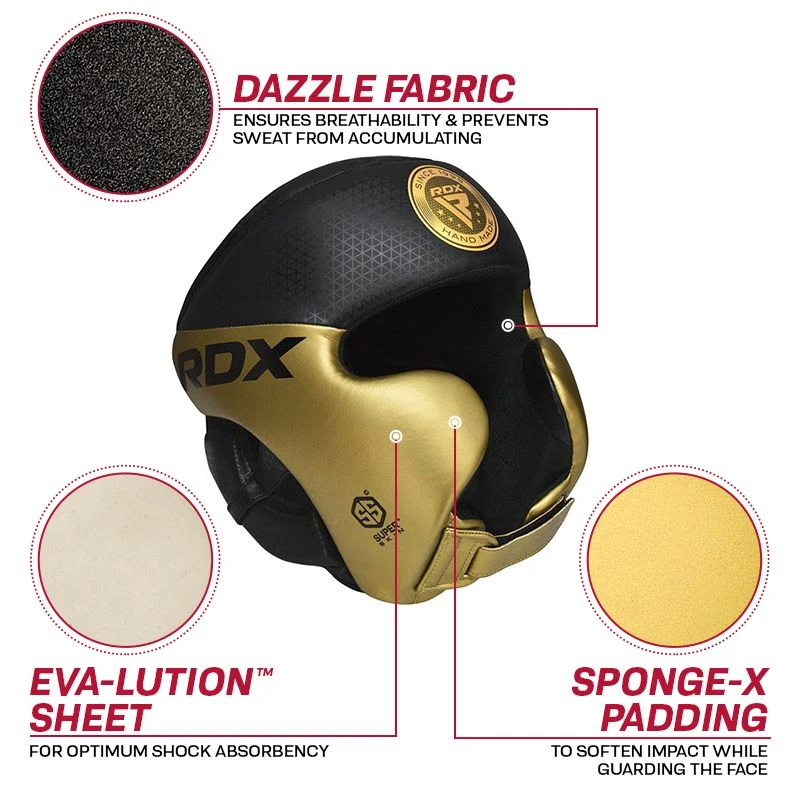 Give your protection gear an ultimate upgrade with the premium RDX Head Guard. Fabricated using comfortable and breathable dazzle fabric inside and super skin combat leather outside, the head guard is a perfect blend of high-end comfortability and top-notch protection. Supermo ShockTM Equilibrium Foam Sheet ensures that the shock is completely dissipated. EVA-LUTIONTM SHEET not only provides decisive protection against hooks and jabs but also keeps you sweat-free while training by providing an excellent passage way to air. Exceptional Sponge X PADDING promises an impeccable construction.